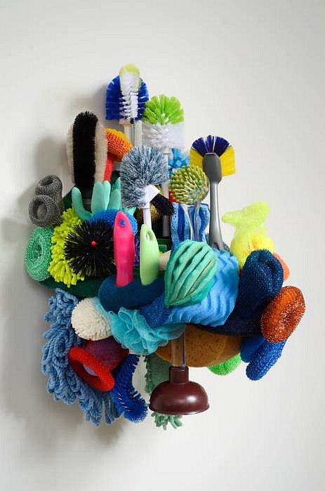 Sponges, scrubbers, scouring pads, mop heads, brushes, plungers, plastic gloves, steel drains, sculpture foam and wood, 20 x 32 x 21 in. (50.8 x 81.3 x 53.3 cm)